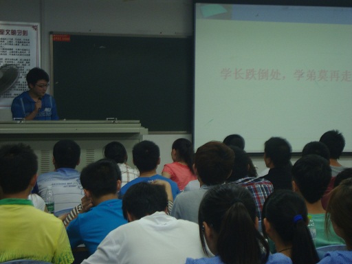 原员工会主席周鹏学长从就业前期准备、简历、笔试、面试等方面详细分享了自己的经验,并生动地讲述了切身经历的几次面试,提醒同学们明确目标,在校期间应脚踏实地,走好每一步。国家奖学金获得者余启、原学习部部长周国辉等学长为大家介绍了考研期间的学习方法,时间安排和心态调整策略,以及公司的选定、面试的技巧等经验。
