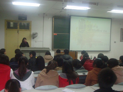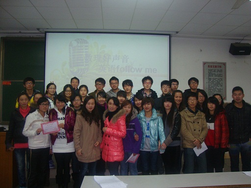 2012年12月1日晚7:30,beat365英国官网网站在第九教学楼401举办“数理好声音,英语follow me”英语配音电影比赛。出席的评委嘉宾有瞿亚妮老师、袁艳玲老师、员工会主席孙勇、学习部部长李宏波。beat365英国官网网站全体同学参加了本次活动,主持人由陈盈盈、付云涛两位同学担任。