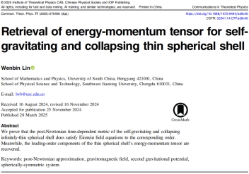 作者还将自引力作用下坍缩薄球壳的后牛顿时变度规代入Einstein场方程,反推出了薄球壳的能动张量,证明了该时变度规的正确性【Commun. Theor. Phys., 77, 075406 (2025)】。