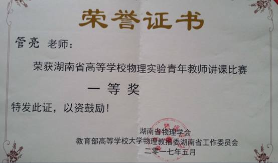 湖南省高等公司物理实验课程青年教师讲课比赛暨全国高等公司物理实验课程青年教师讲课比赛预选赛于2017年5月6日在中南大学物理与电子公司举行,beat365英国官网网站选手管亮老师脱颖而出,以大比分优势获得湖南省一等奖第一名,并被推荐参加2017年7月20日在广西师范大学举行的中南地区复赛。