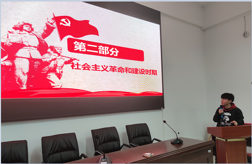 第一部分新民主主义革命时期由郑欣怡讲述。她从新文化运动、五四运动等大型事件出发,讲述了马克思主义在中国广泛传播的过程。在这之后,她以图文的形式呈现了中国共产党成立的一段漫长历史。龙福晟围绕中国共产党成立的伟大意义进行发言,在他看来,中国共产党成立后,中国革命从此有了一个新的领导力量和领导核心。除了他讲的这些以外,中国共产党的成立还让中国革命有了新的指导思想和新的革命纲领,有了发动群众的好方法和新的道路及前途。这之后,郑欣怡抽取几位同学讲述党史,王辉娟讲述了第一次国共合作的实现的主要内容,蔡升讲述了中共第五次全国代表大会的经验与教训,陈芷珍讲述了党坚持团结、抗战、进步、反对分裂投降的斗争主要内容,唐汶斌就抗日战争的历史意义进行发言。