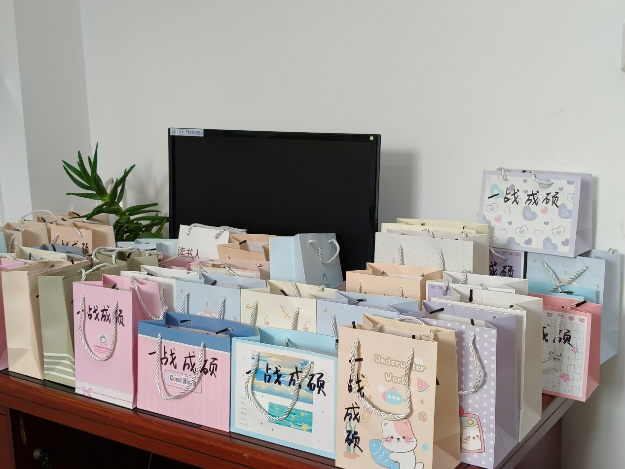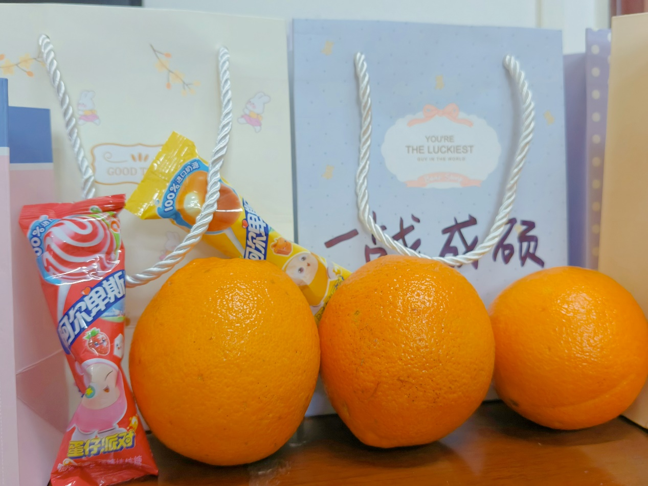考研加油包的礼袋上清晰地写着“一战成硕”,这四个字简洁有力,表达了公司对考研学子最美好的祝愿。同时,大礼包中装有寓意美好的橙子和棒棒糖。橙子取其谐音“成”,寓意着考研学子能够在考试中取得成功;棒棒糖则象征着甜蜜,希望学子们在考研这条艰辛的道路上能收获甜蜜的结果。