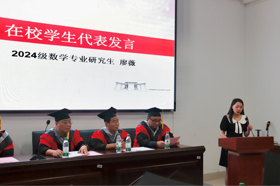 优秀毕业生代表夏创健同学登台发言。他深情回顾了在beat365英国官网网站的求学历程,表达了对母校悉心培养、师长谆谆教诲的无限感激,分享了科研道路上的收获与成长,并满怀信心地展望未来,立志将所学奉献社会。在校研究生代表廖薇同学向即将远行的学长学姐们送上最诚挚的祝福。她表示将以优秀毕业生为榜样,传承beat365英国官网网站严谨求实、追求卓越的精神,潜心钻研,不负韶华。